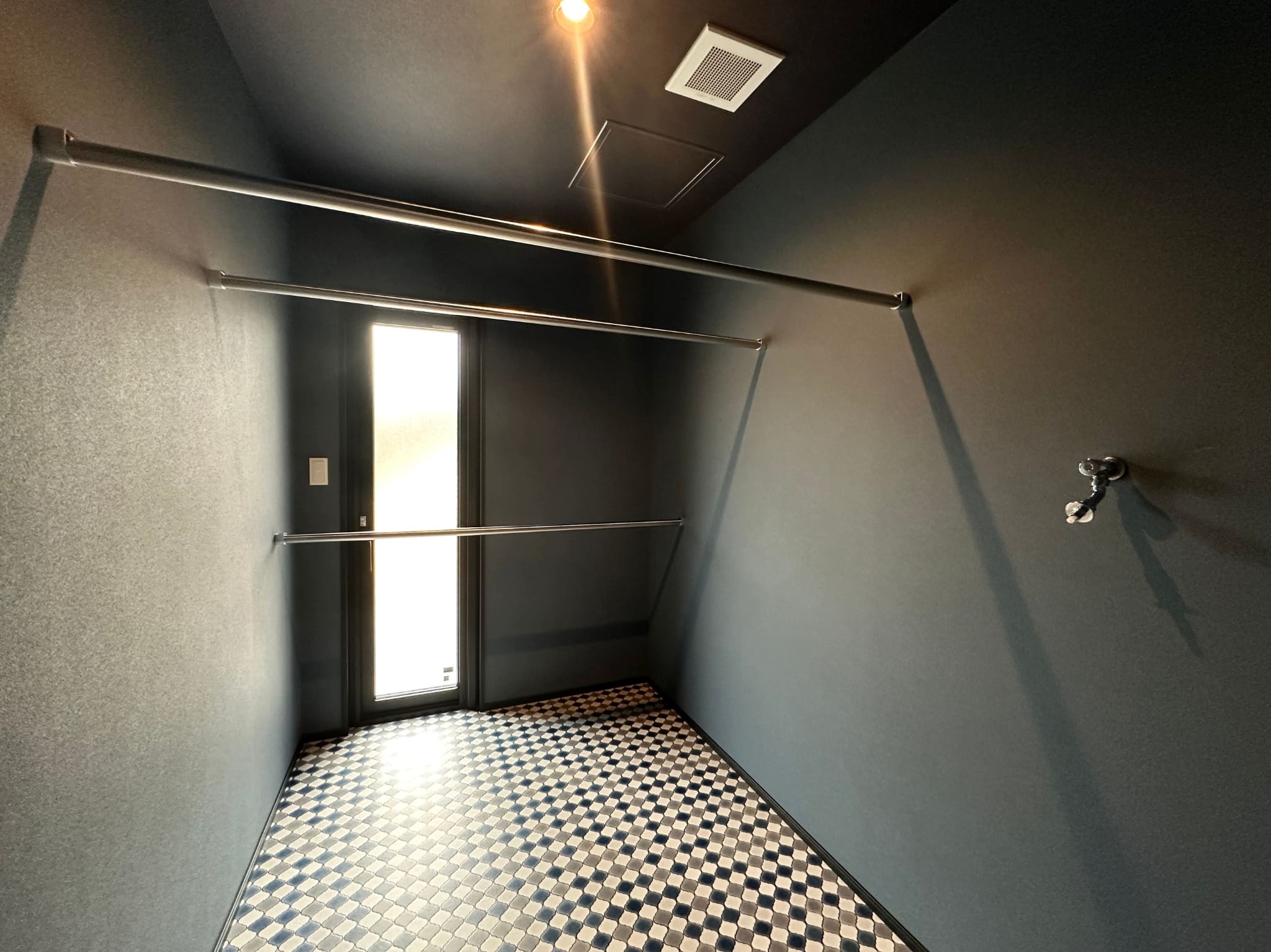 洗面脱衣室の横には約3帖のランドリールームを設けました。ハンガーパイプを設置し、室内干しができる便利な空間。窓から自然光も入るため、明るく風通しのよいランドリールームです。