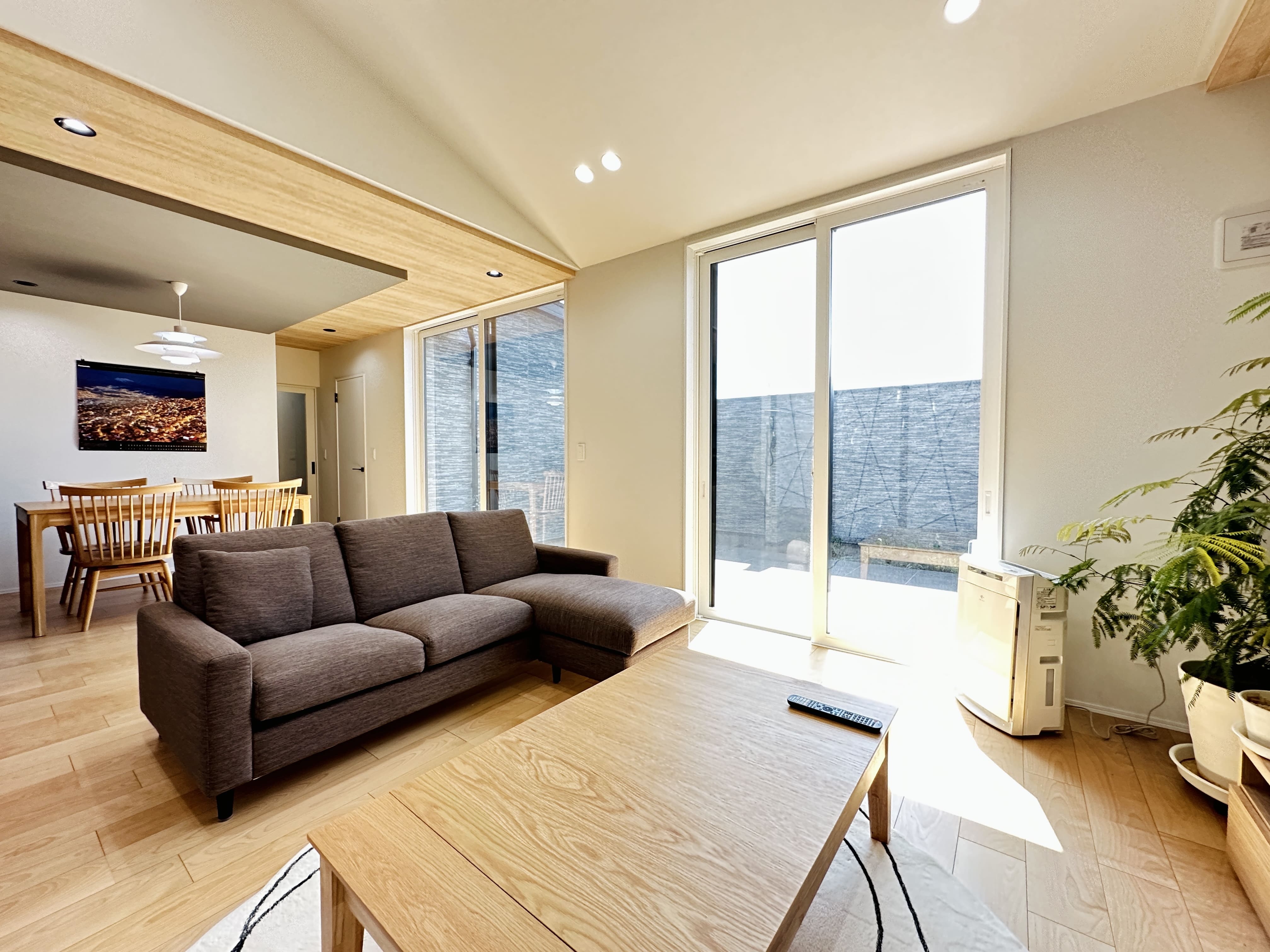 勾配天井が生み出す、のびやかなリビング。 大きな窓の先には中庭が広がり、外と内がゆるやかにつながる設計に。視線が抜けることで、より一層の広がりと心地よさを感じられる空間です。