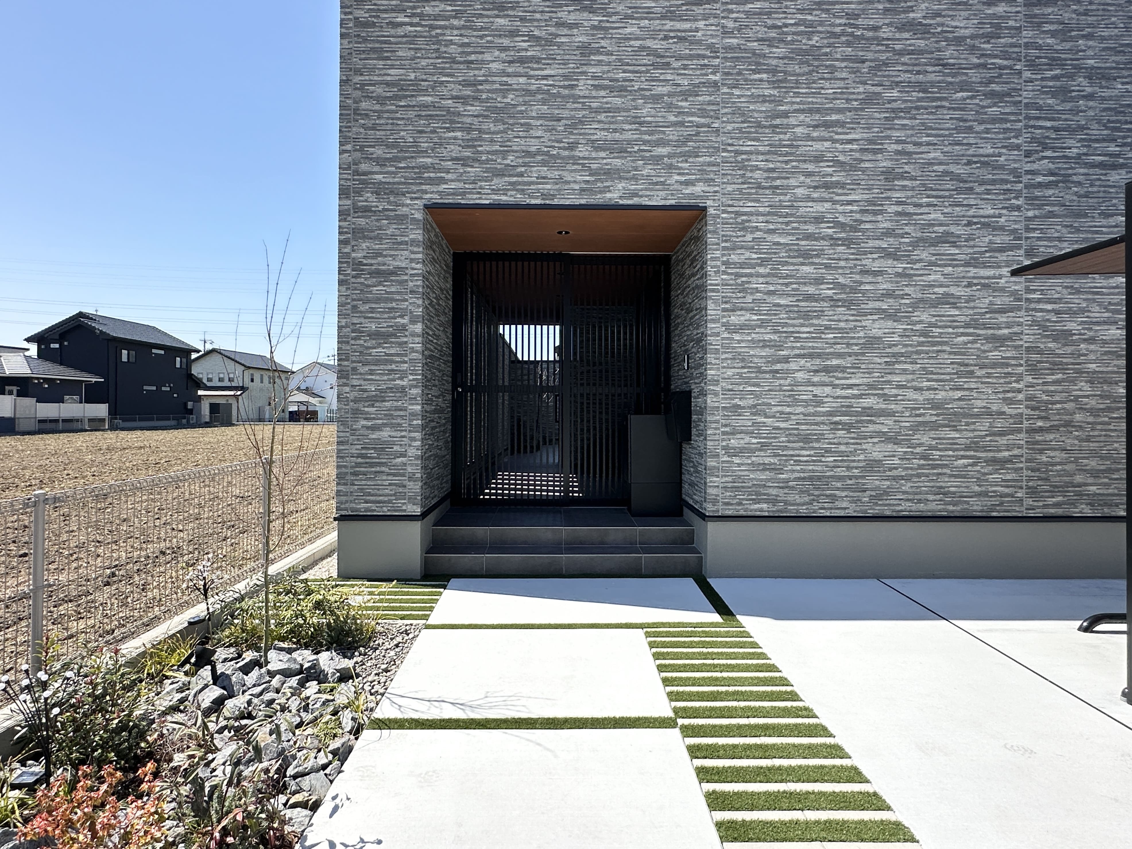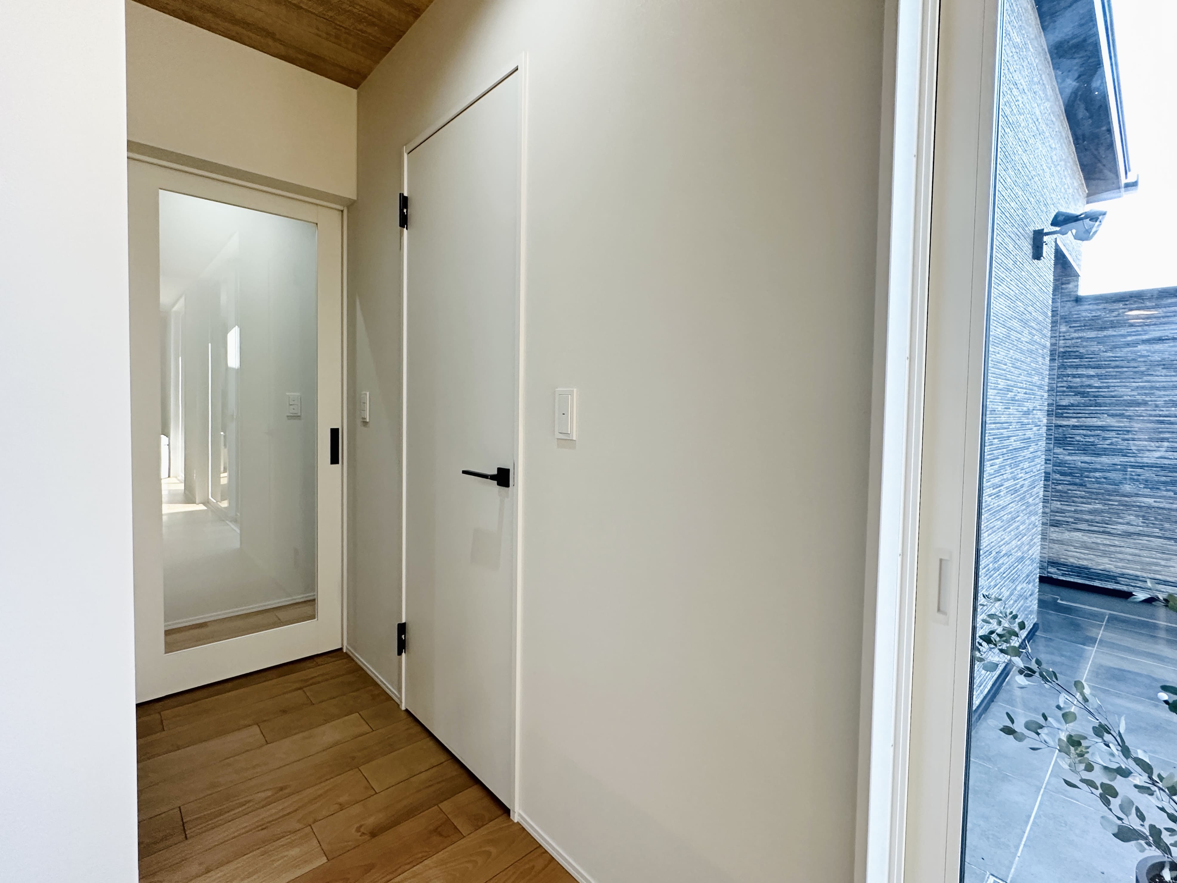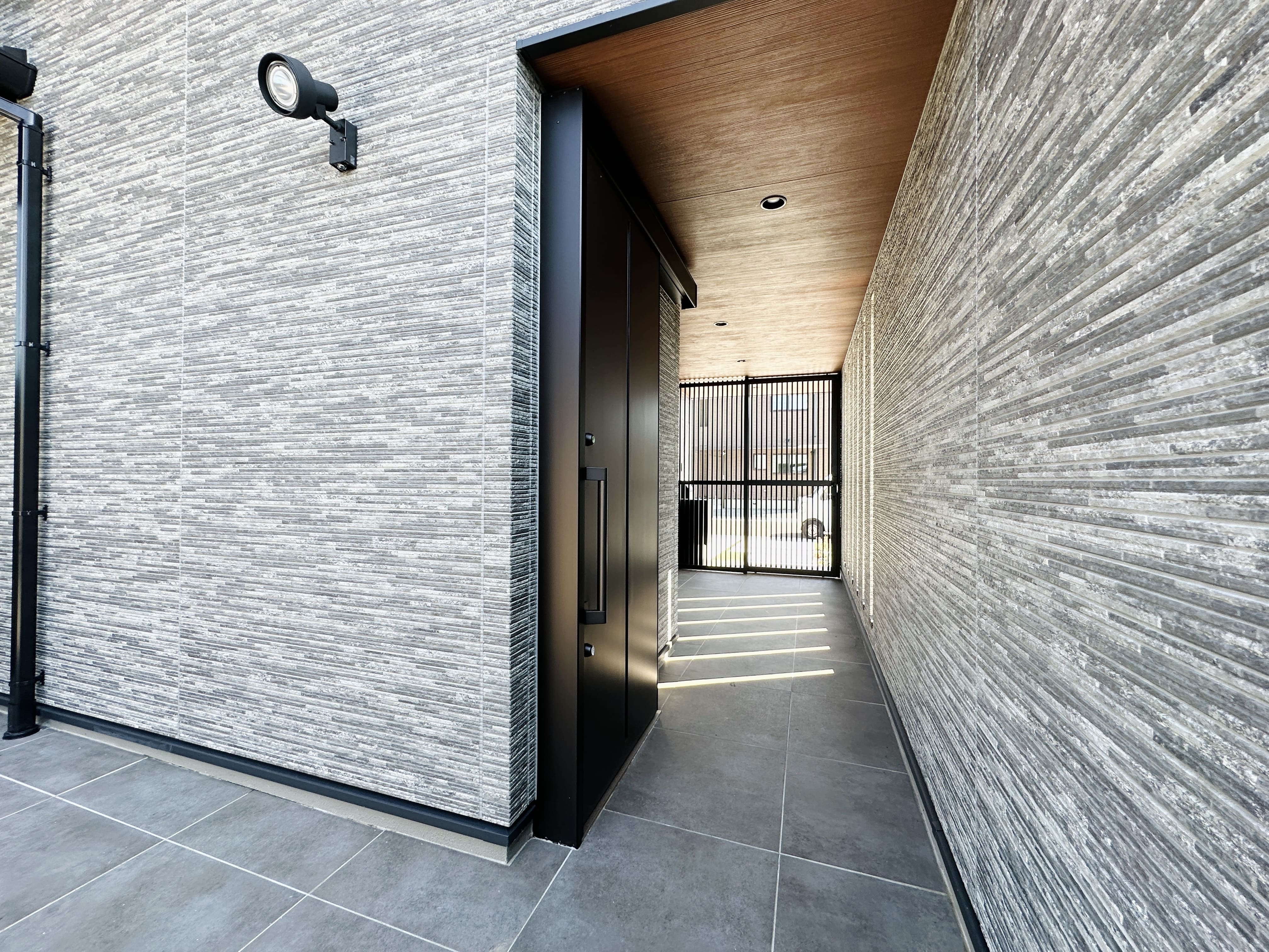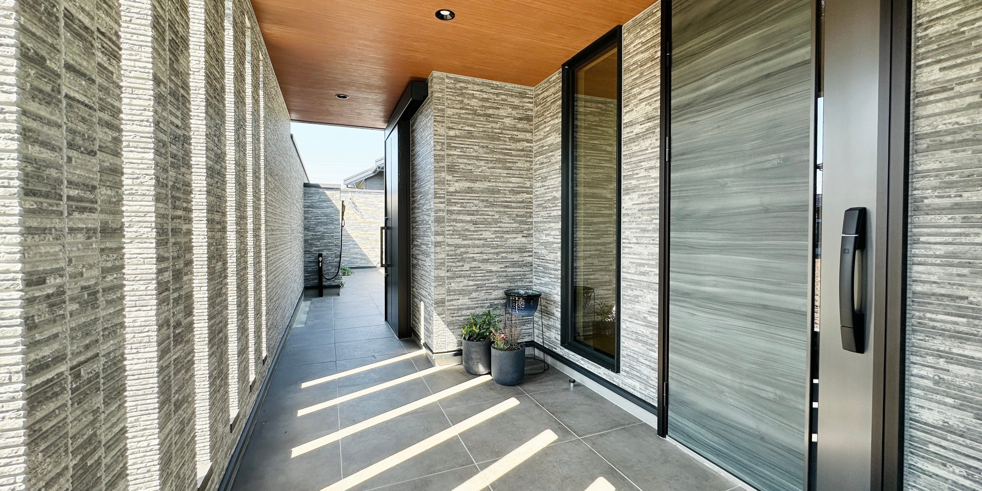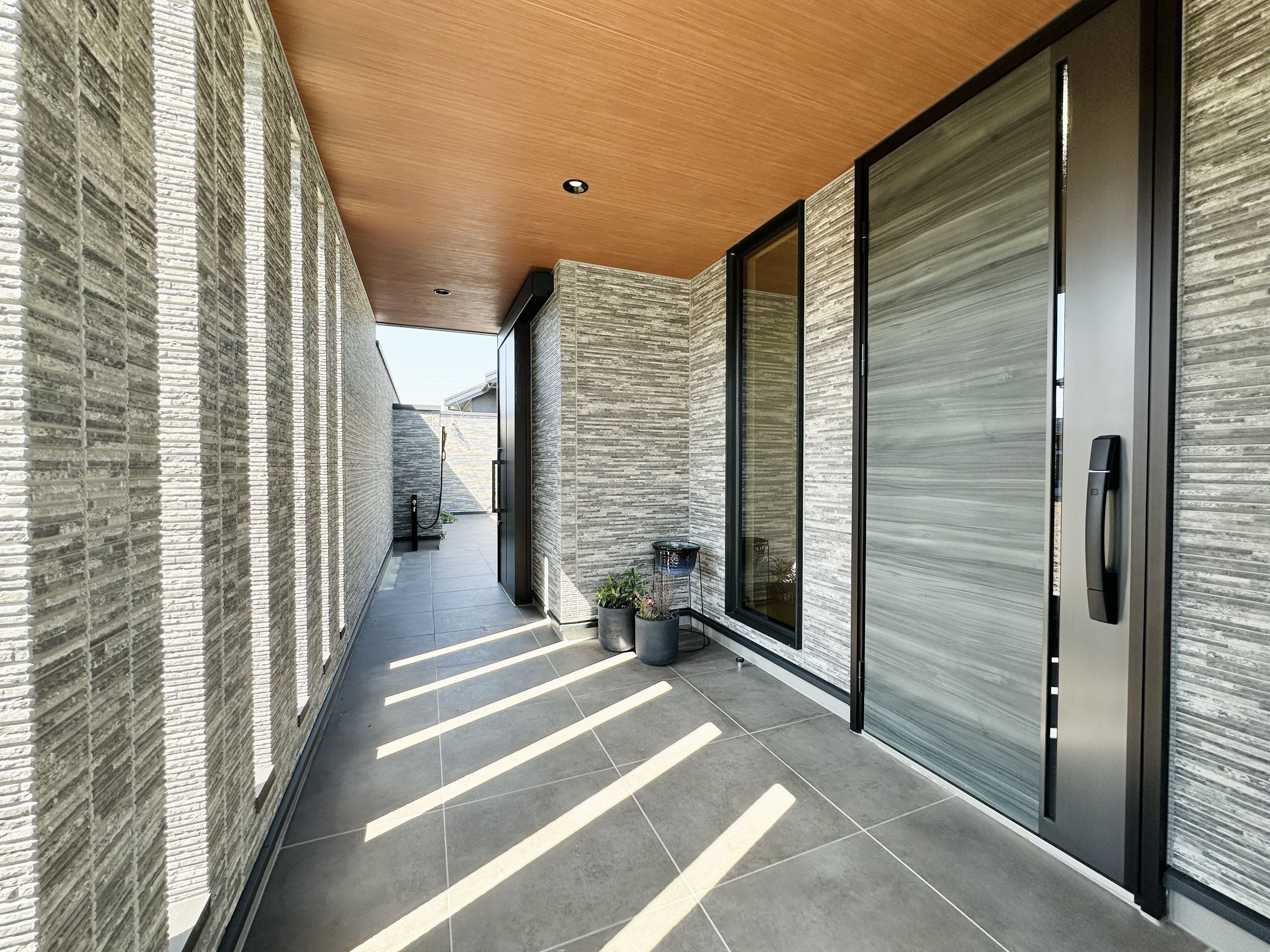 スリットからこぼれる光が心地よい玄関ポーチ。FIX窓からやわらかな光が差し込み、明るく開放的な玄関に。ポーチの先には中庭が広がり、奥行きとつながりを感じられます。