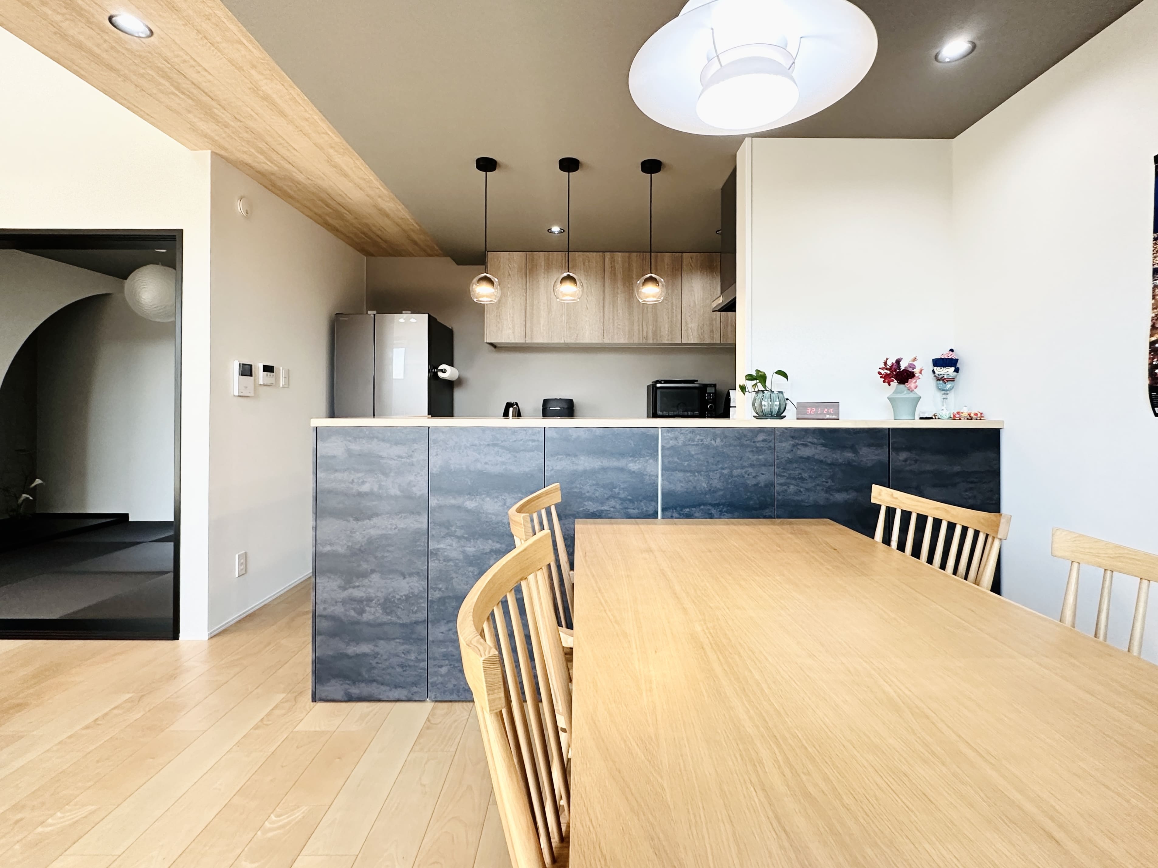 マットな質感が特徴のキッチンは丸みのあるペンダントライトで柔らかさをプラス。 引き締めとやさしさが調和した、バランスのよい空間に仕上げています。