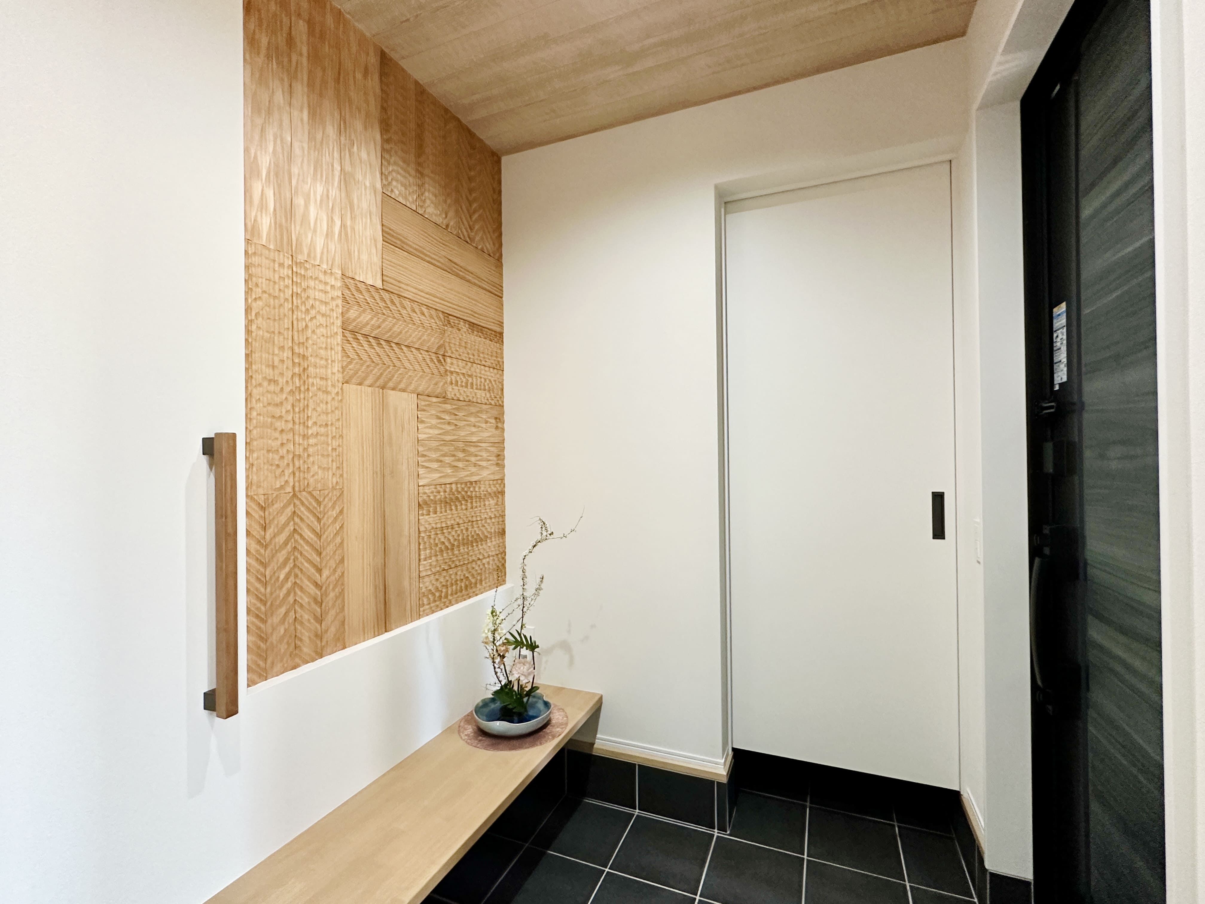 扉を開けた瞬間に感じる、和モダンのやすらぎ。手すり付きベンチとデザインウォールが、使いやすさと美しさを兼ね備えた玄関です。