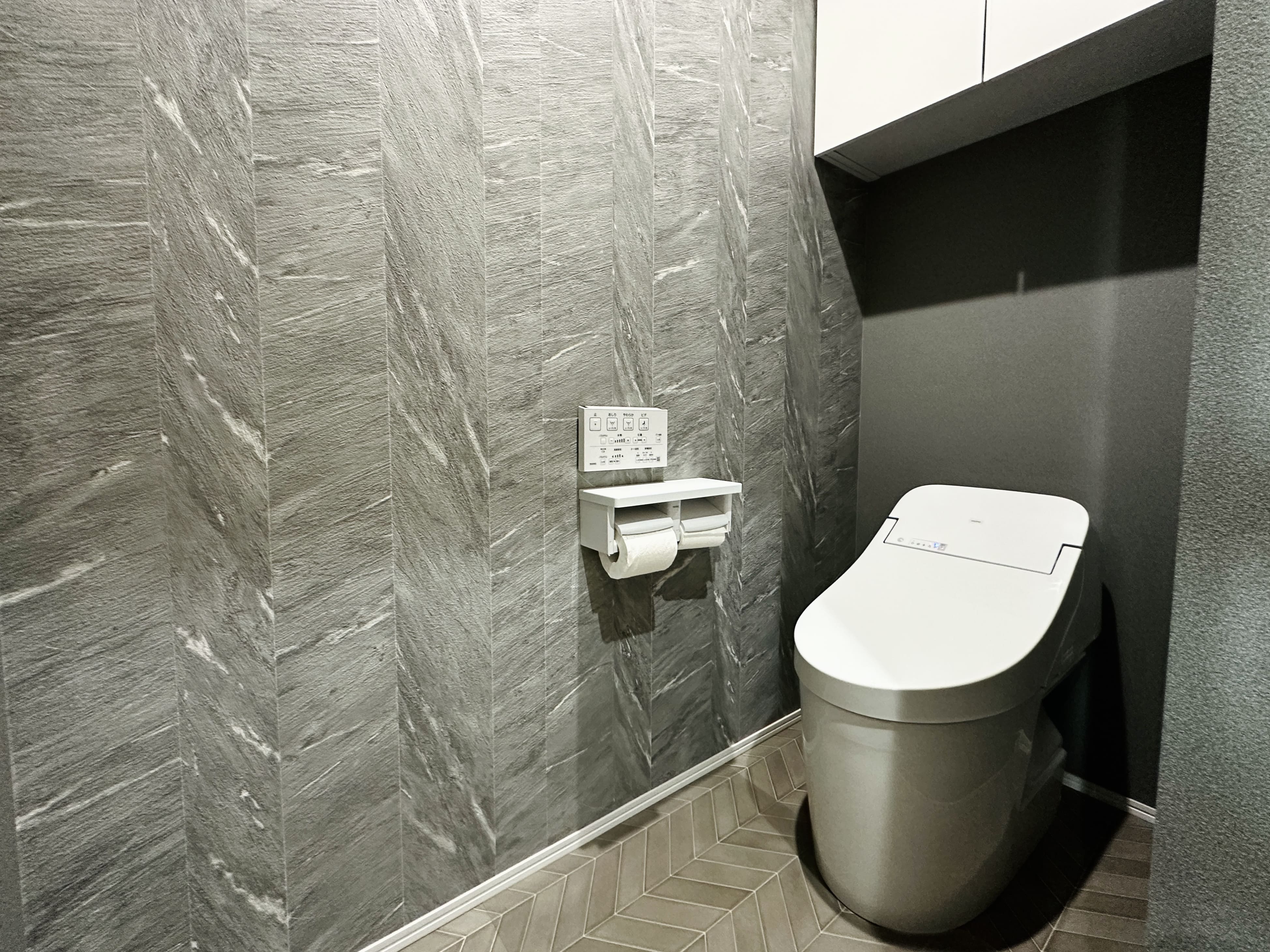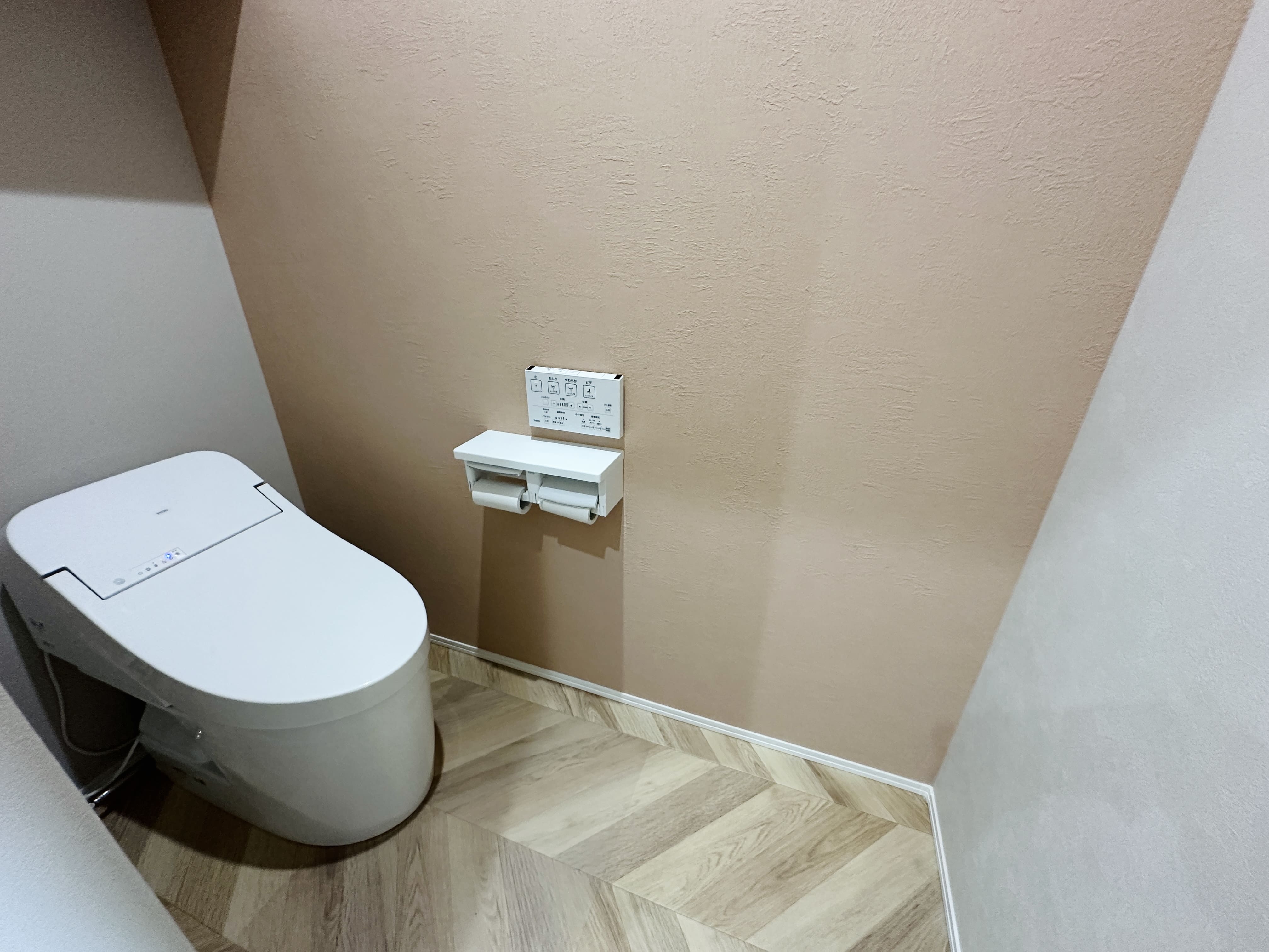 グレイッシュピンクのクロスとヘリンボーン柄の床を組み合わせた2階のお手洗い。 やわらかさの中に落ち着きを感じる、甘さを抑えた空間に仕上げています。