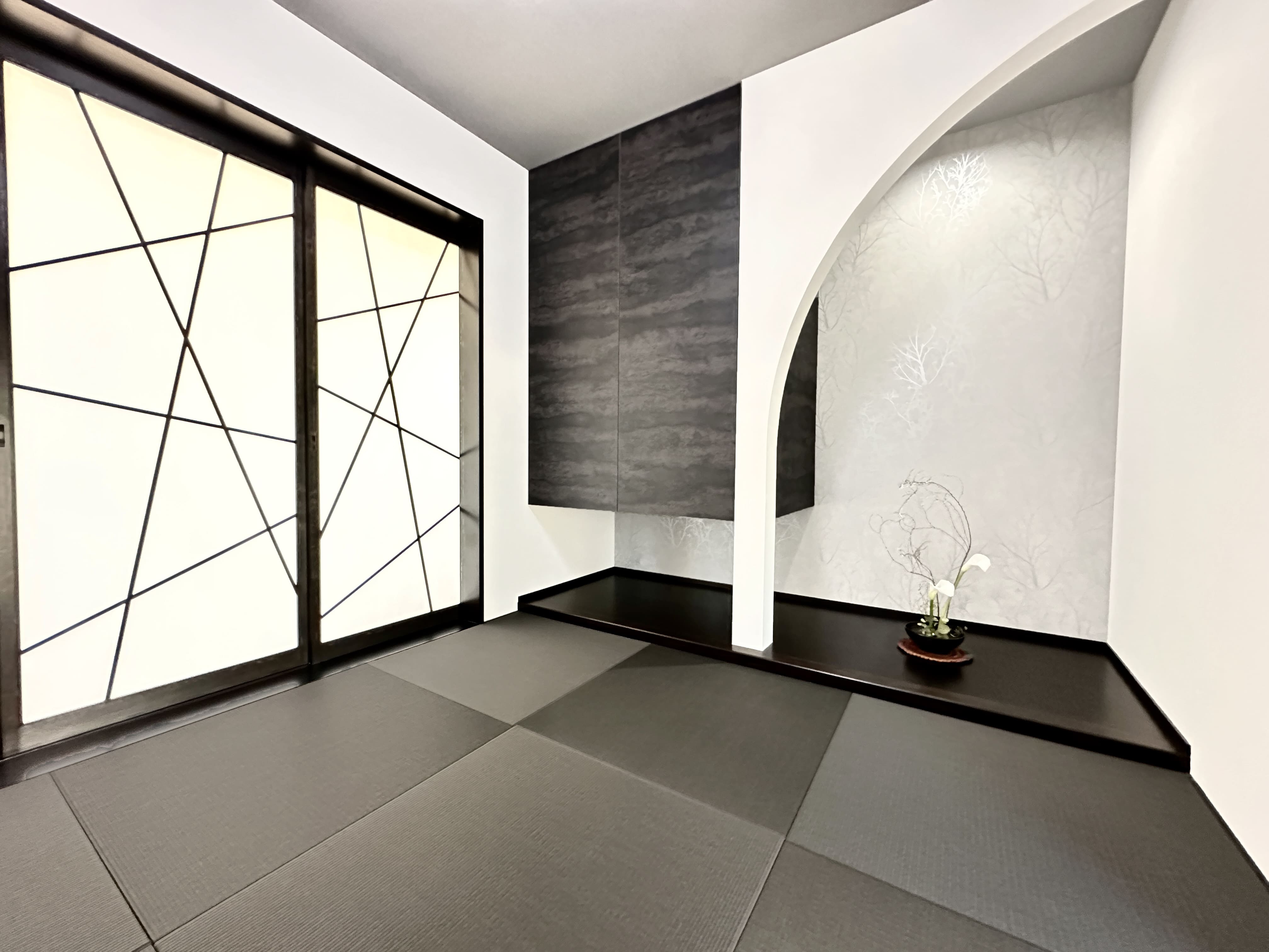 床の間を設けた空間に、ダークトーンを取り入れたモダンで洗練された約4.5帖の和室。アールの垂れ壁がやわらかなアクセントとなり、デザイン障子が空間に上品な表情を添えています。