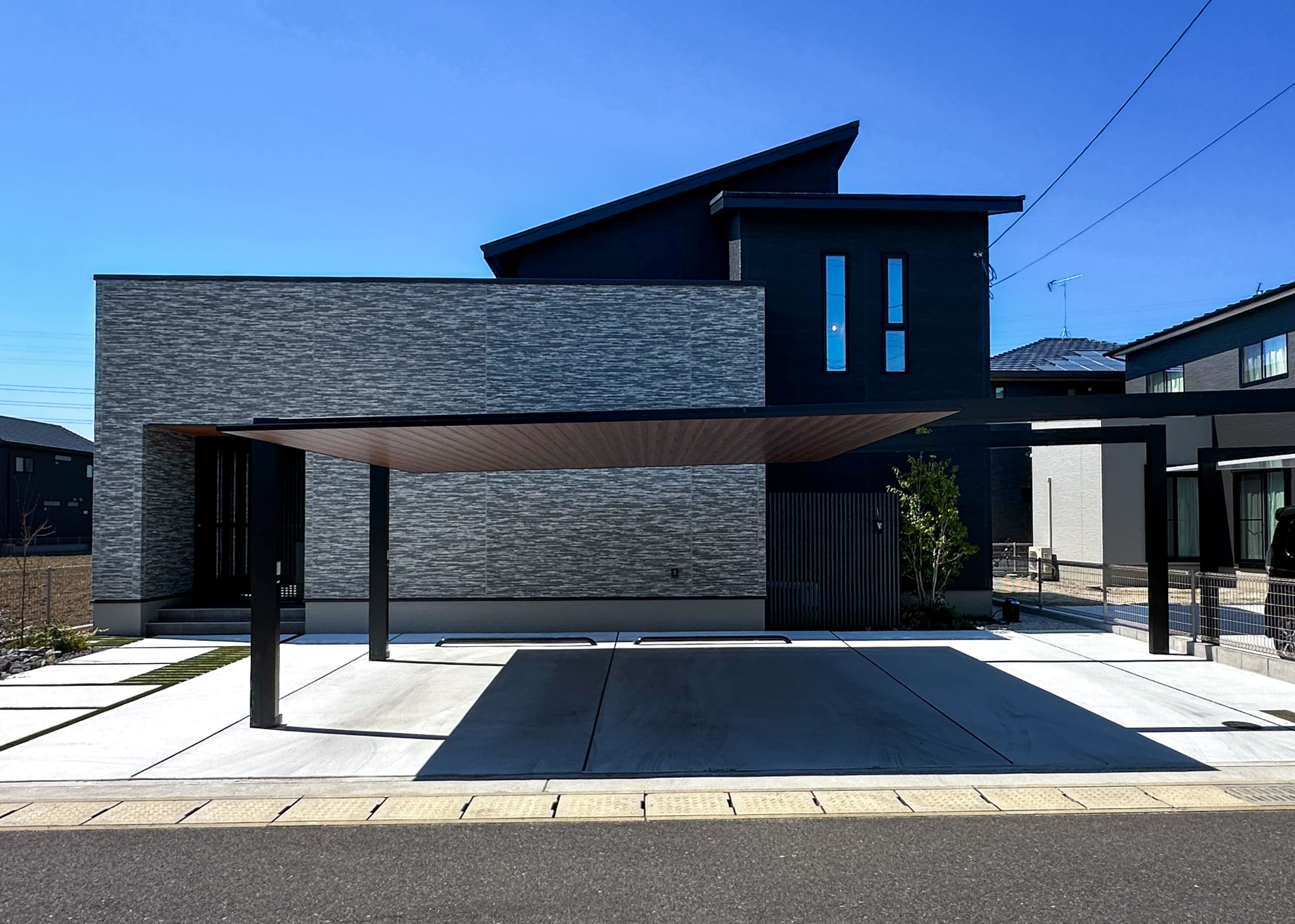水平ラインが美しい和モダンの外観。 カーポートを設け、3台分の駐車スペースを確保。ご家族用はもちろん来客時にも安心の、ゆとりのある外構計画です。