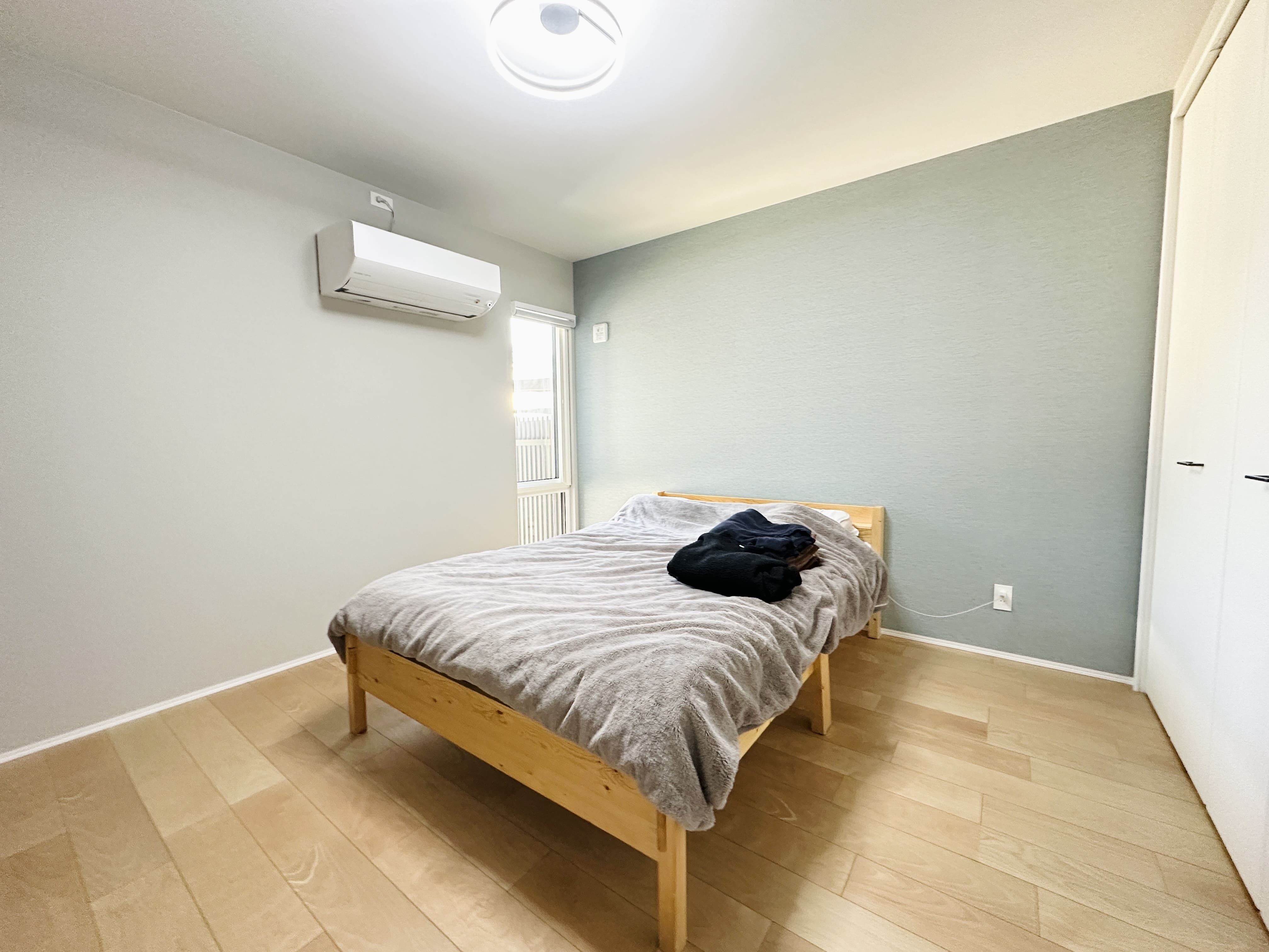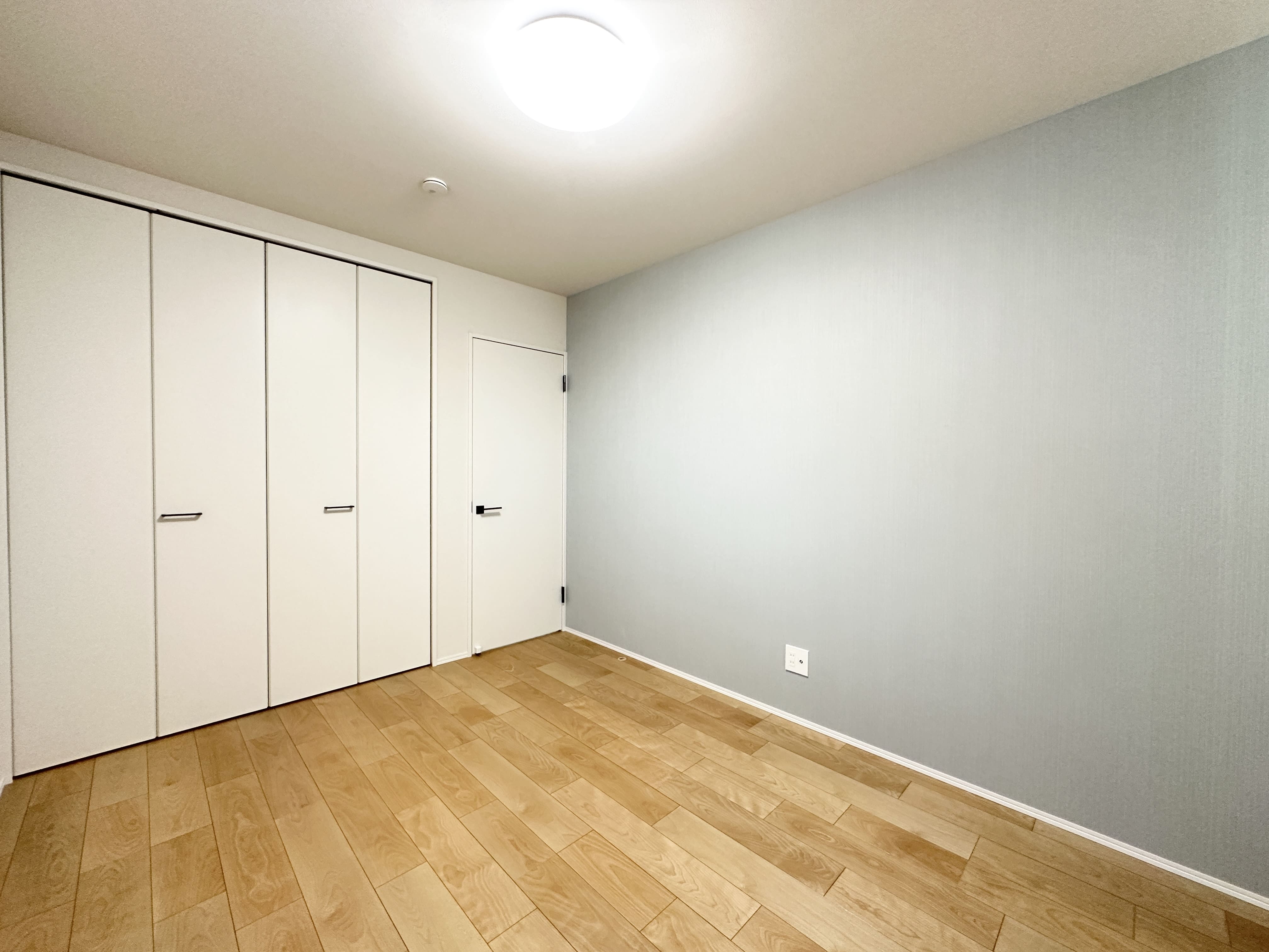 2階に設けた6帖の洋室。 落ち着いたブルー系のアクセントクロスが、やわらかな表情を生み、穏やかに過ごせる一室に。
