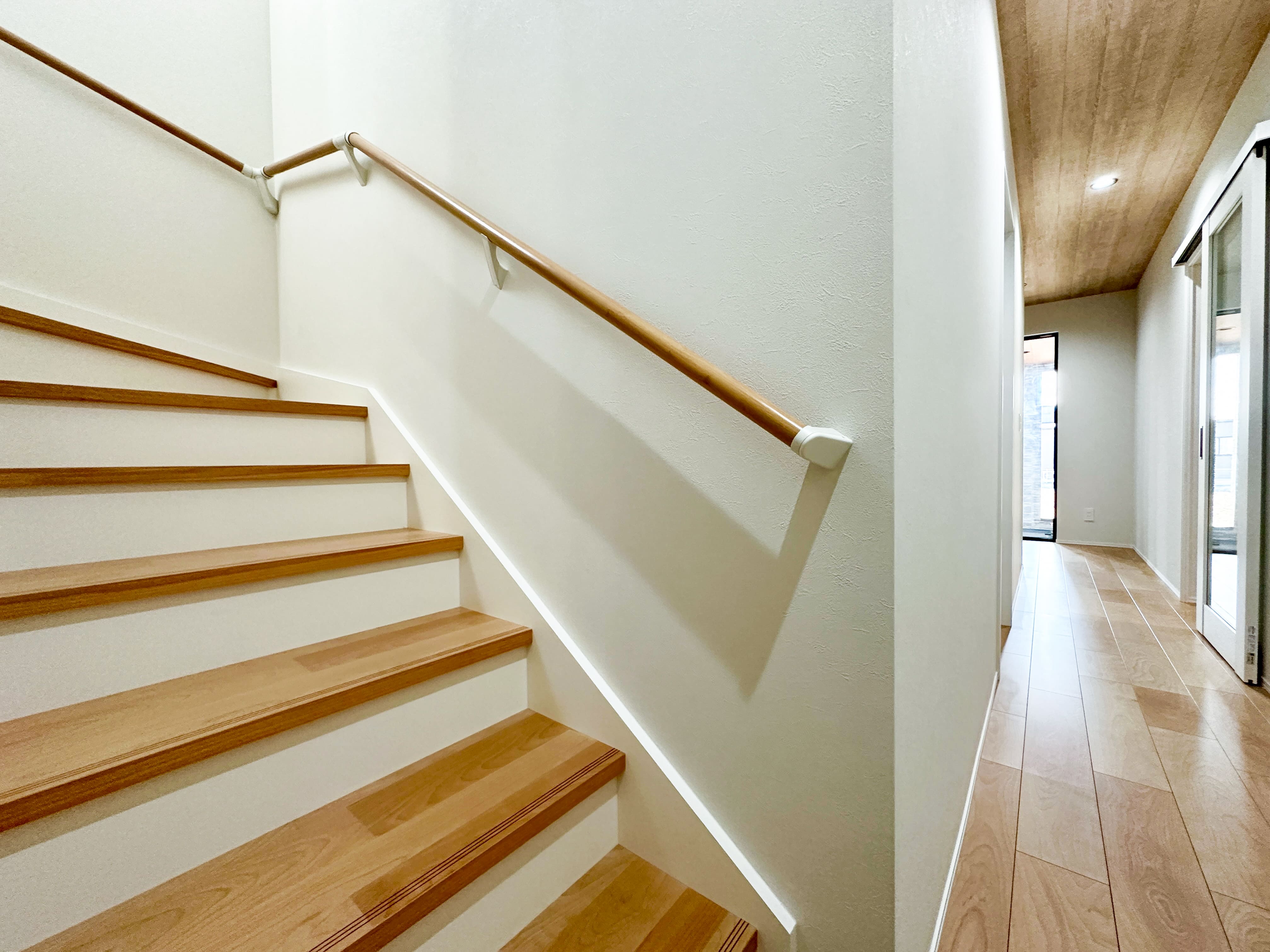 段の高さを通常より低く設定した階段。 将来を見据え、お子さまからご高齢の方まで安心して使えるよう配慮しています。日々の負担を軽減した優しい設計です。