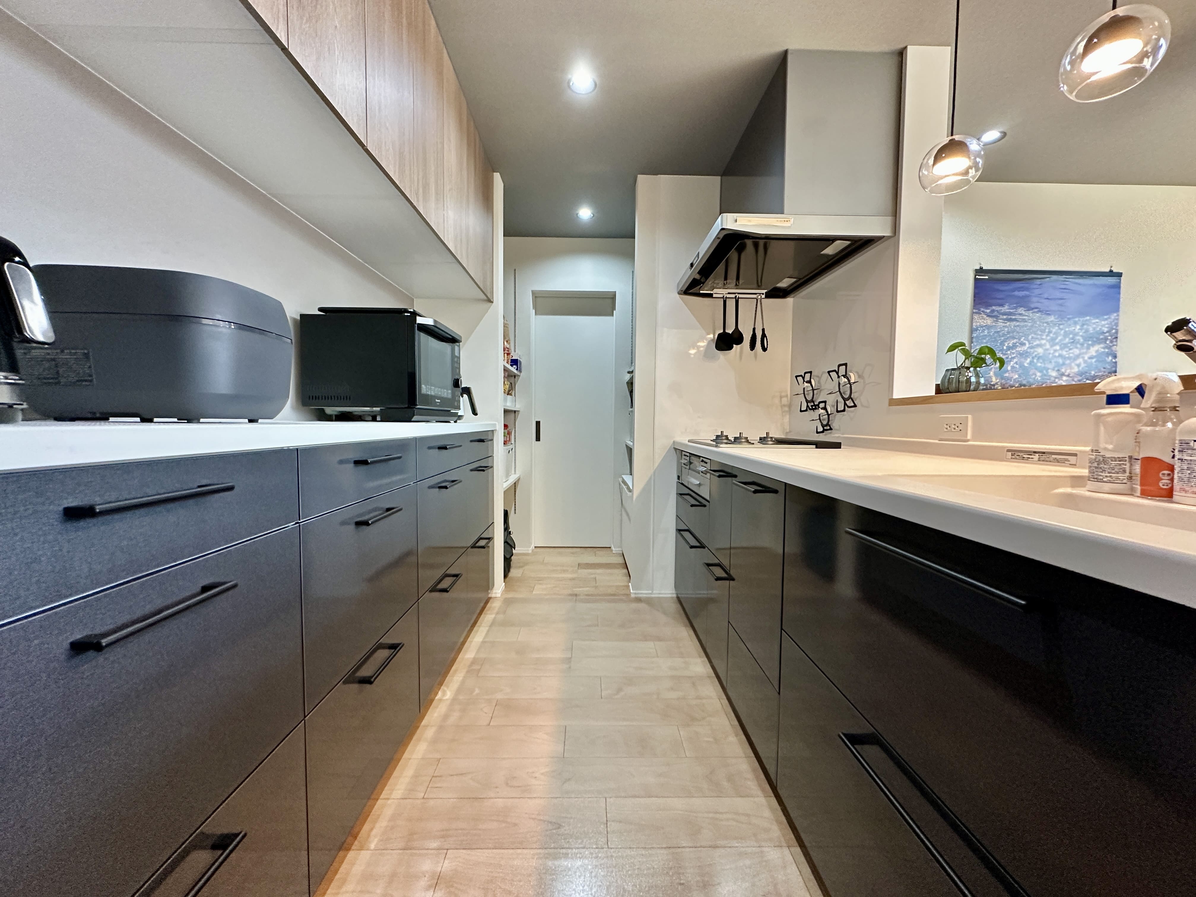 キッチンの奥にはパントリーを配置。 奥のドアから廊下へとつながる、スムーズな動線設計です。買い物帰りの収納や、家事も効率よくこなせる、使い勝手のよい設計です。