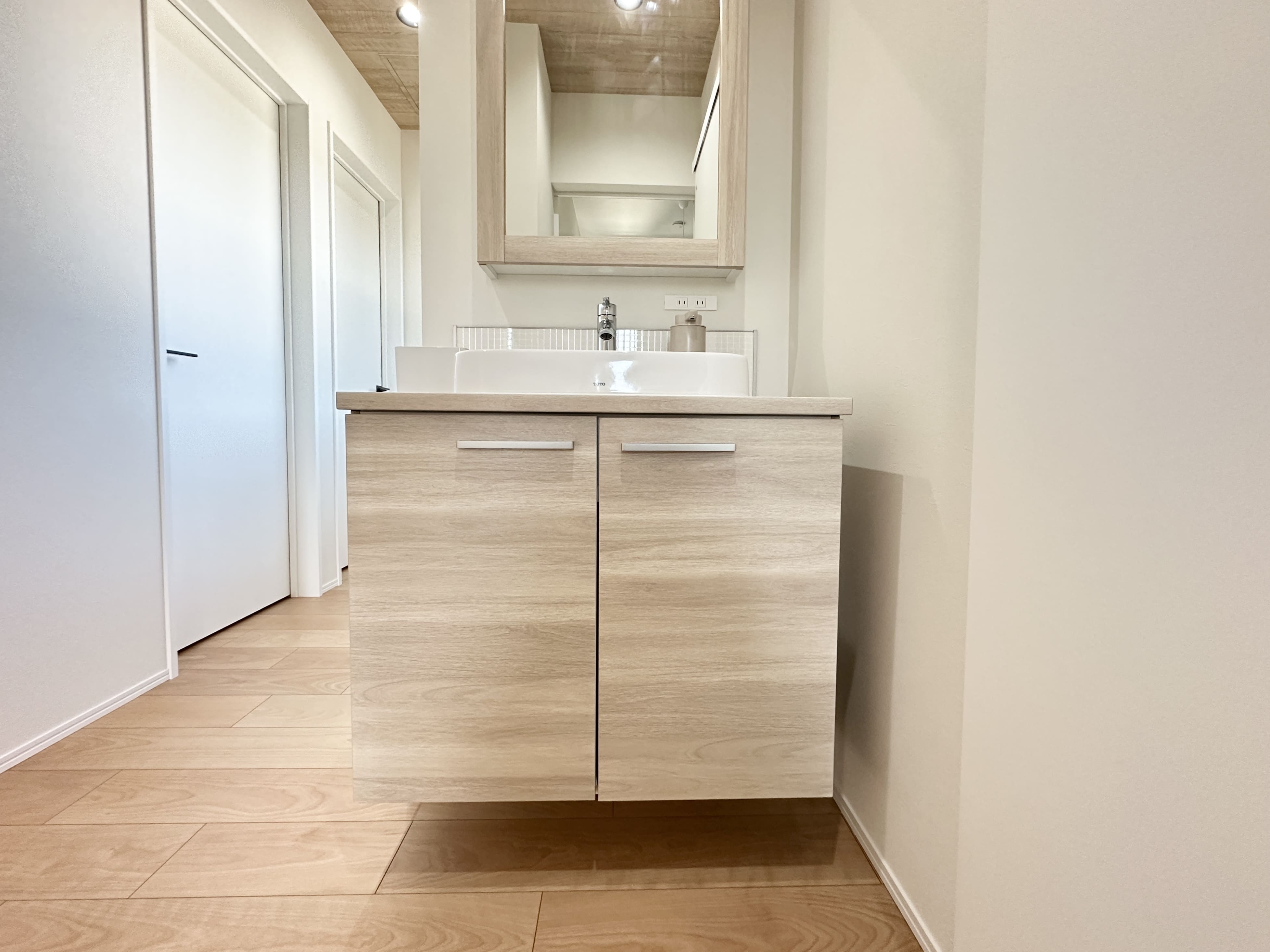 2階に設けた洗面化粧台は、ナチュラルなテイストで柔らかくまとめた空間。木目調のフレームをあしらったミラーが、温かみのある印象を引き立てます。