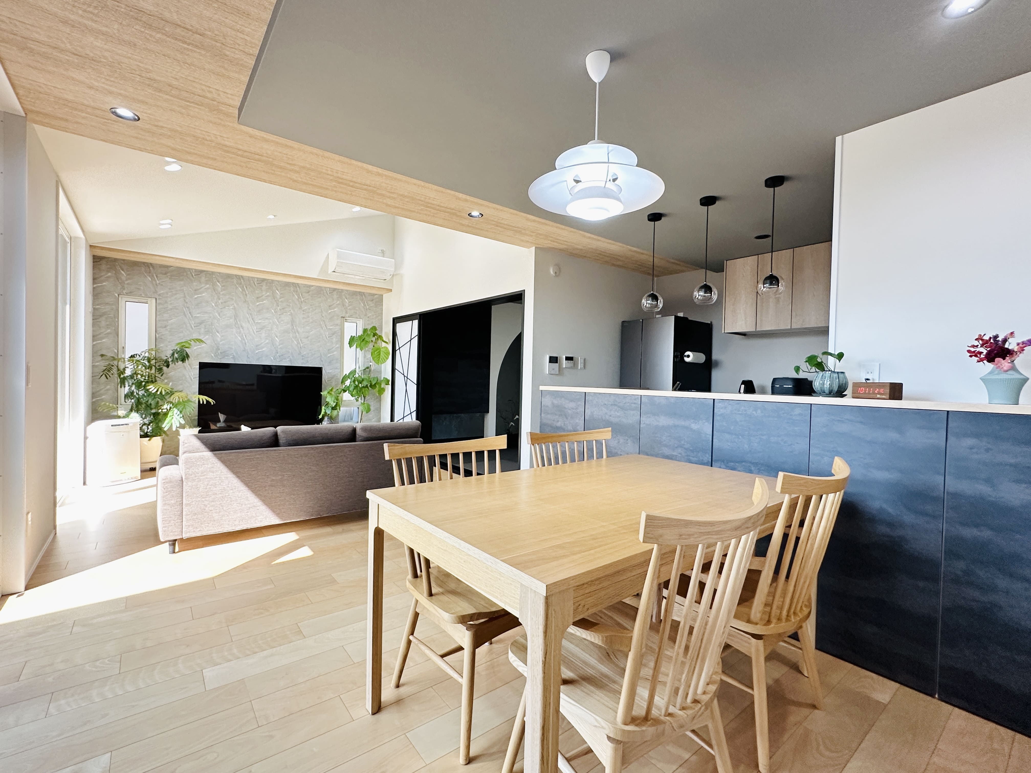 20.5帖のゆとりあるLDK。 天井にはダークグレーのクロスを採用し、空間をほどよく引き締めています。 やわらかな雰囲気の中にコントラストを効かせ、上質さを感じられるバランスの取れたリビングです。