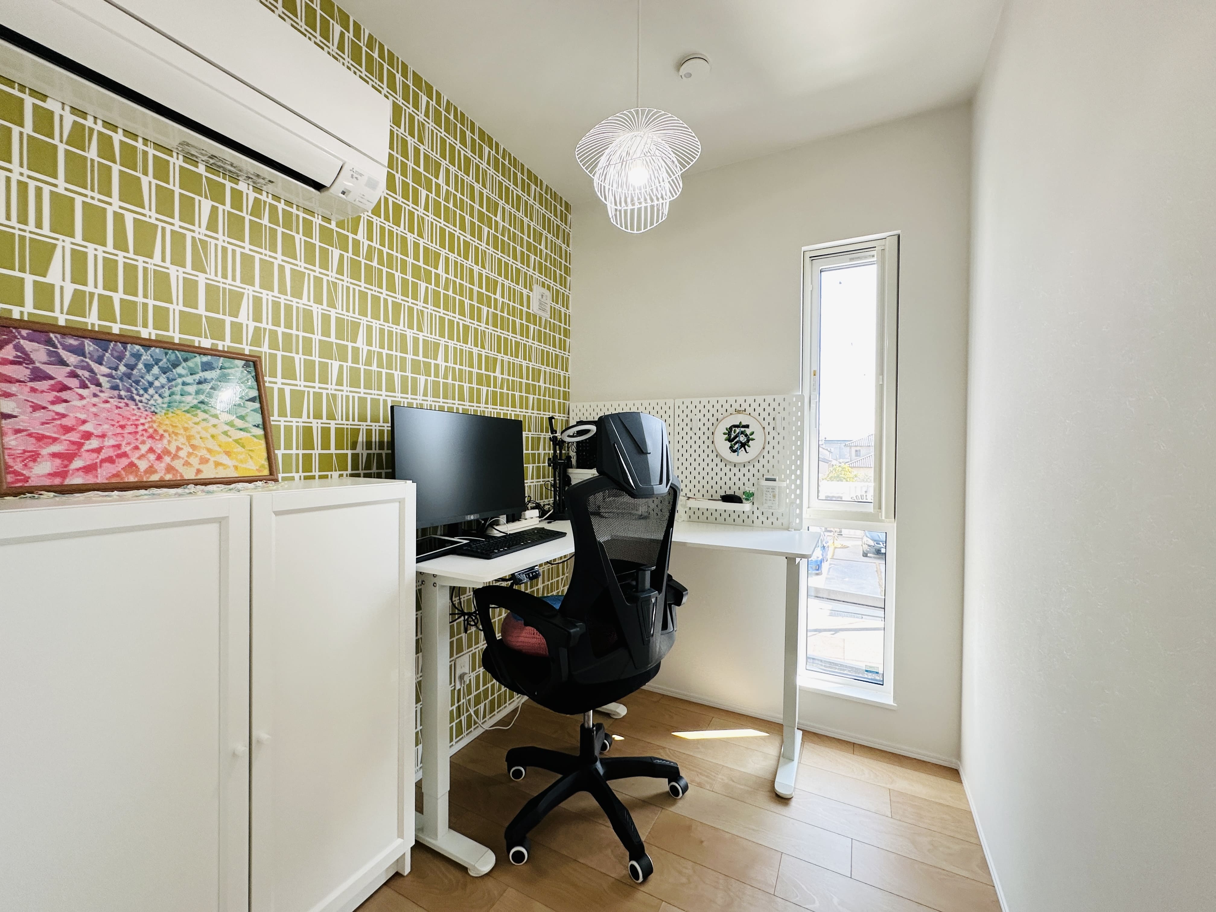 2.5帖の書斎は、北欧調の柄と照明のコーディネートで、空間に統一感を。 縦長の窓から光が差し込み、オンとオフを心地よく切り替えられる空間です。