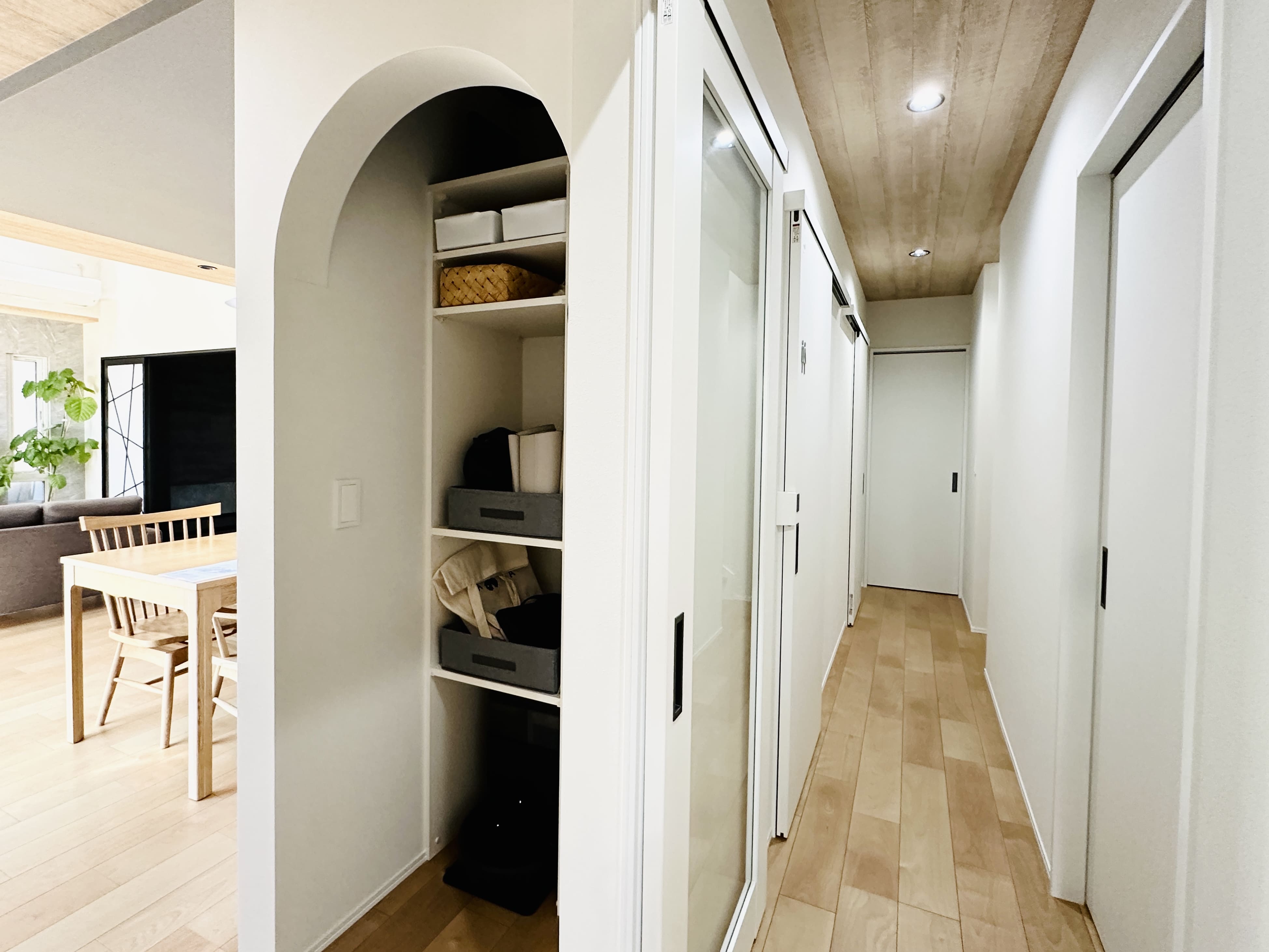 リビングに入ってすぐ目に入るアーチ垂れ壁の物入れ。やわらかな曲線が空間にアクセントを加えながら、見た目と使いやすさを両立しています。
