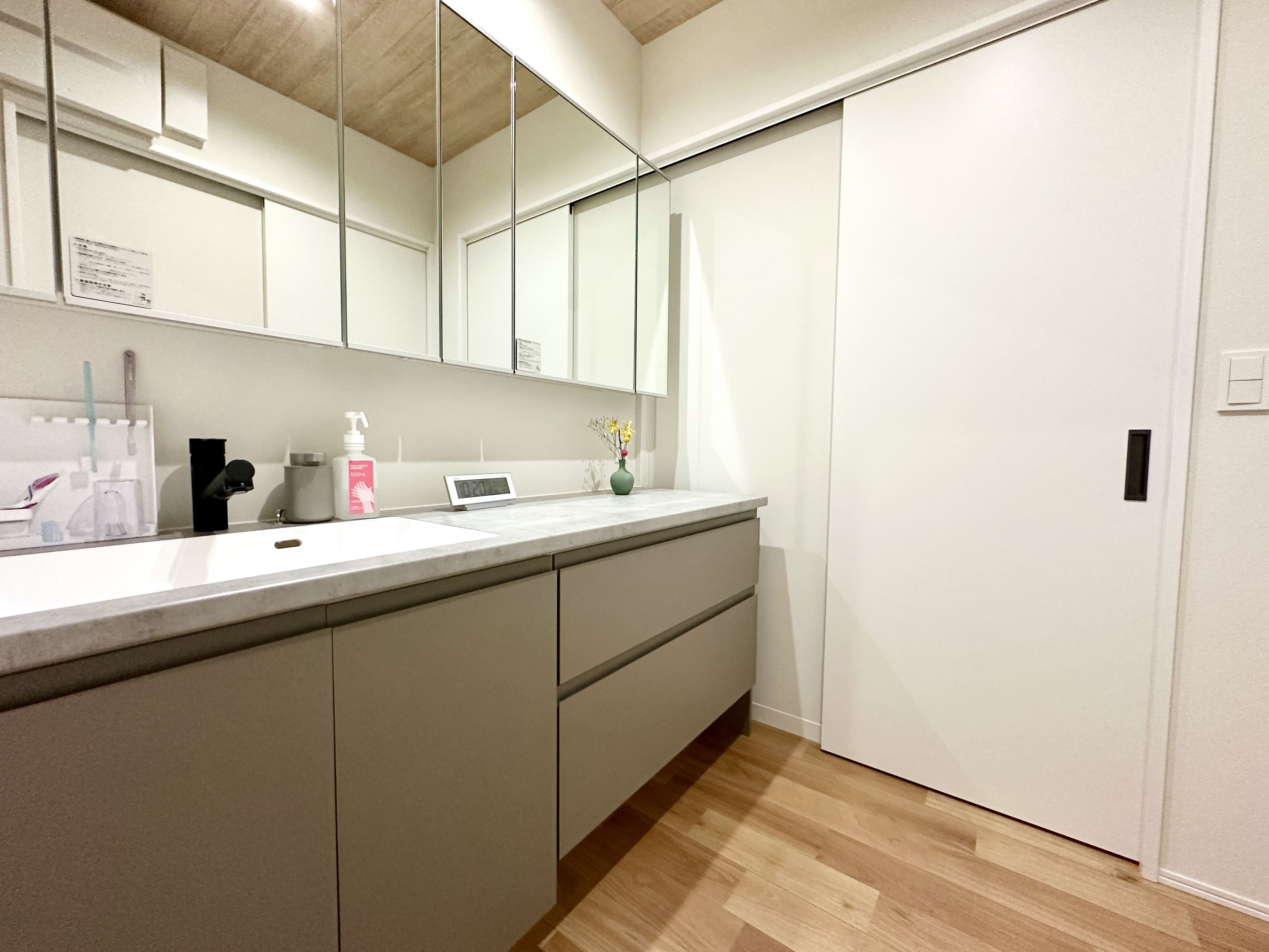 造作のような見た目と機能性を兼ね備えた、アイカのスマートサニタリー。 スモーキーなトーンのコンクリ調のカウンターと扉カラーが調和し、空間を落ち着いた印象に整えています。