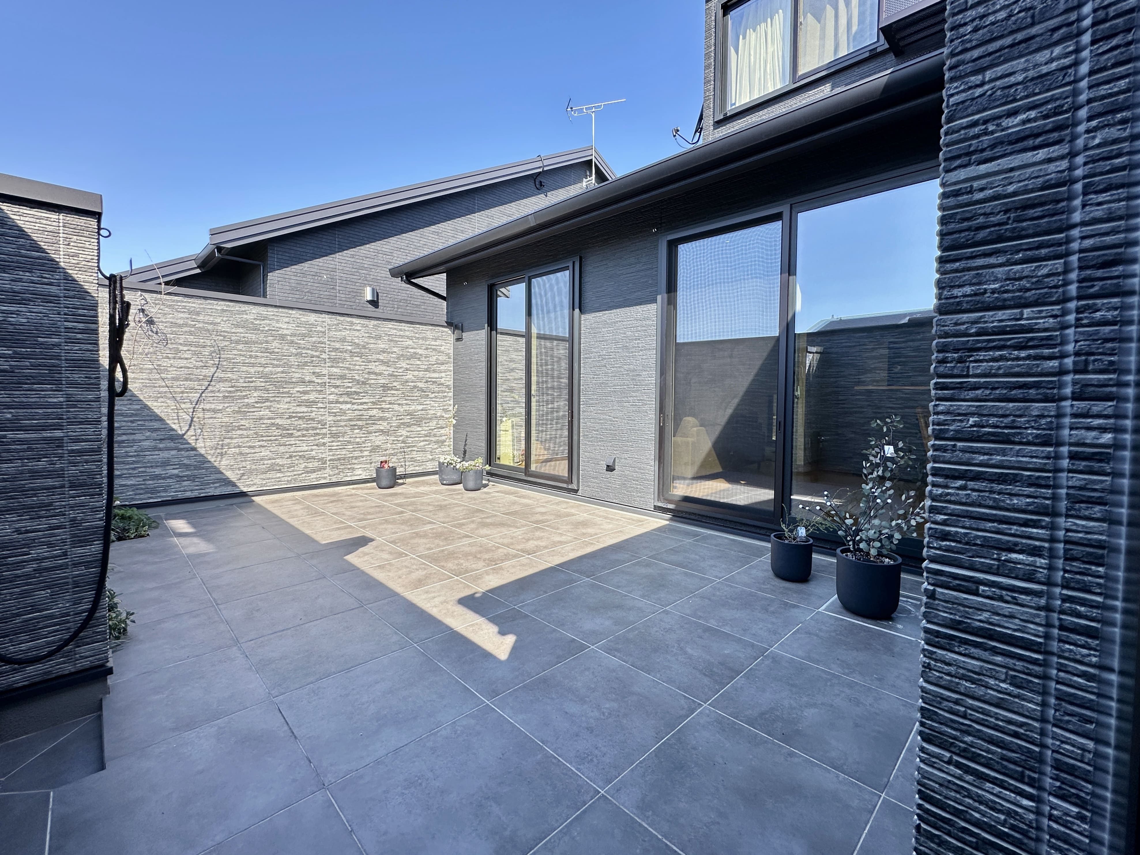 16帖のタイルデッキを設けた中庭。 ファサード壁により、やわらかな光に包まれながら、カーテンに頼らない心地よい暮らしを叶えます。