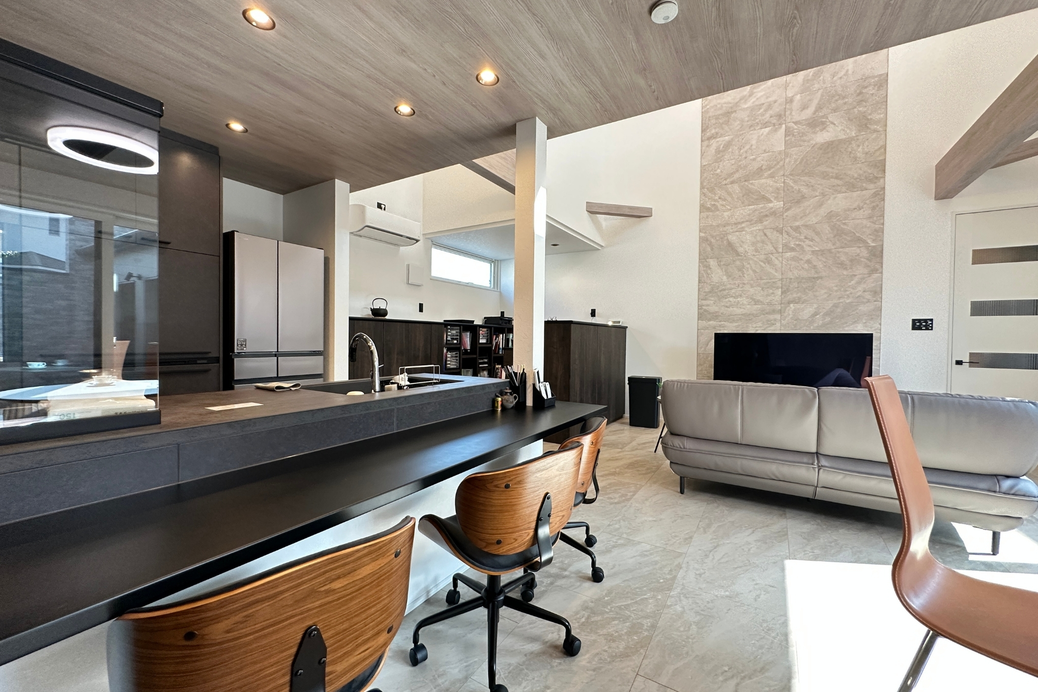 グレーの陰影が美しい、ビルトインガレージを備えた一部二階建ての上質な住まい